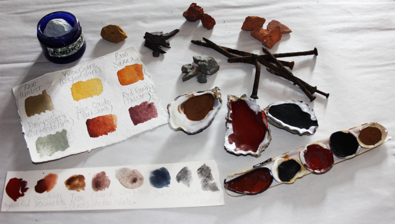 In the morning we will source and grind our colours, mixing them with historic binders to create a range of watercolour paints poured into shells, the traditional palette.